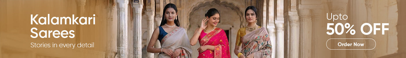 Kalamkari sarees are a striking blend of contemporary fashion and traditional artistry. These sarees are handcrafted and famous for their detailed floral and faunal motifs of nature, mythology, and history, which are either painted or block-printed. Along with the heritage and culture of Telangana and Andhra Pradesh, these sarees are a reflection of Indian handcrafted art. They are woven using timeless methods.