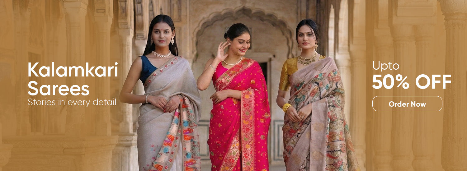 Purchasing Kalamkari sarees from us means supporting traditional artisans, which adds social value to the purchase alongside the unparalleled quality received. Every piece from the vivid Kalamkari print sarees to the sublime Kalahasti Kalamkari sarees is crafted with heritage, comfort, and grace.