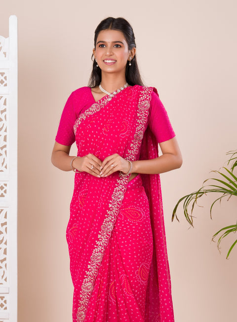 KcPc Special Mos chiffon Hand Pitta aari Work Bandhani Saree STL
