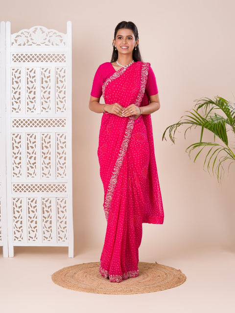 Fabric Moss Chiffon Pattern/Style Bandhani Style Embellishment Pitta Aari Handwork Occasion Party/Traditional wear Washcare Drywash Length 6.15 meter approx WITH BLOUSE Width 44 inch approx Dispatch time (if pre-order) 10...